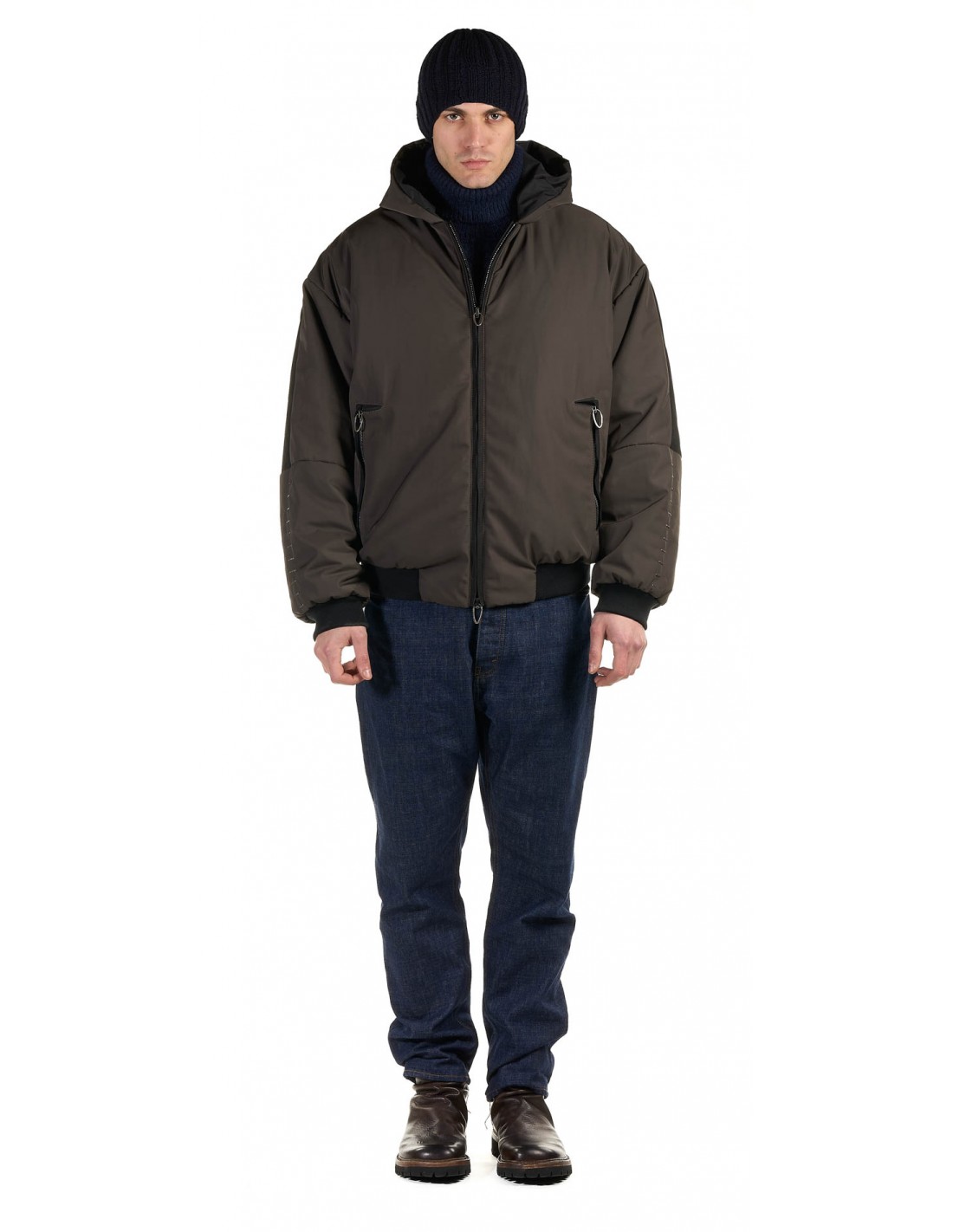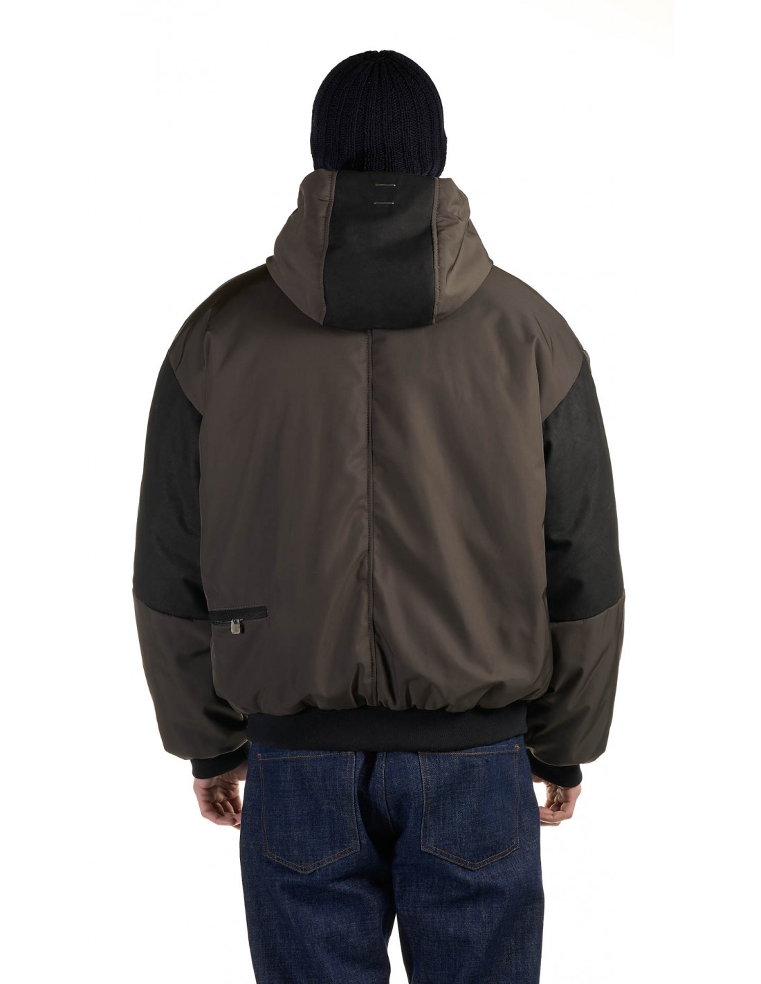 Bomber jacket in waterproof and water-repellent technical fabric with calf leather details